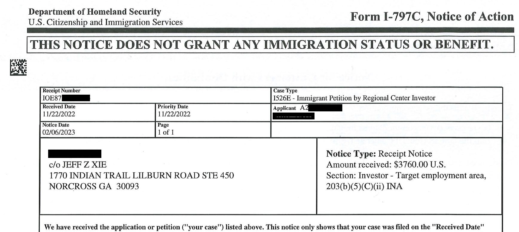 但是这封收件信非常重要,上面注明了申请人的投资项目类型。这个项目类型决定投资人拿到绿卡的资格和可能需要等待的时间。