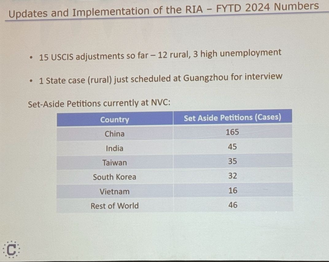 会议邀请的美国国务院负责签证计算的数据分析师Michael Hanley先生到会作主题演讲。Hanley先生向与会者展示大量的各种签证计算数据。我们获得的对“双递”窗口最有价值的信息是美国国务院对新政EB5 签证名额的审批数字和计算方法: