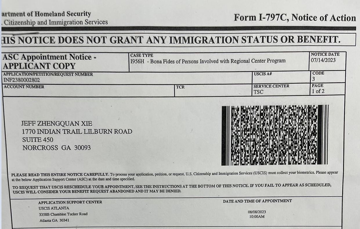 2023年7月31号收到移民局发来的打指纹通知,要求8月8号上午10点去亚特兰大申请支持中心(Application Support Center, 简称ASC)打指纹。