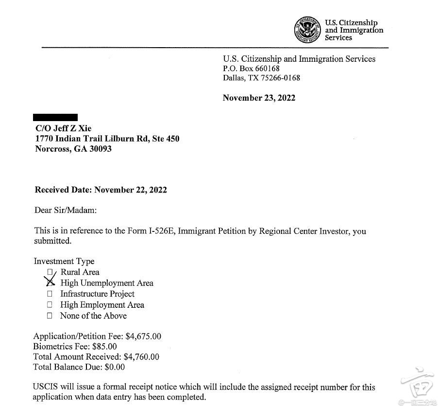 但是这封收件信非常重要,上面注明了申请人的投资项目类型。这个项目类型决定投资人拿到绿卡的资格和可能需要等待的时间。